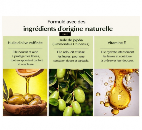- Enrichie : Avec huile d’olive, huile de jojoba et vitamine E.