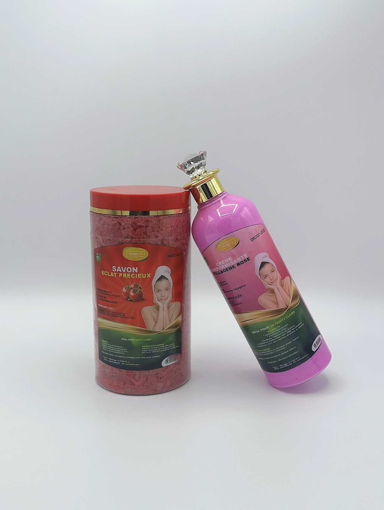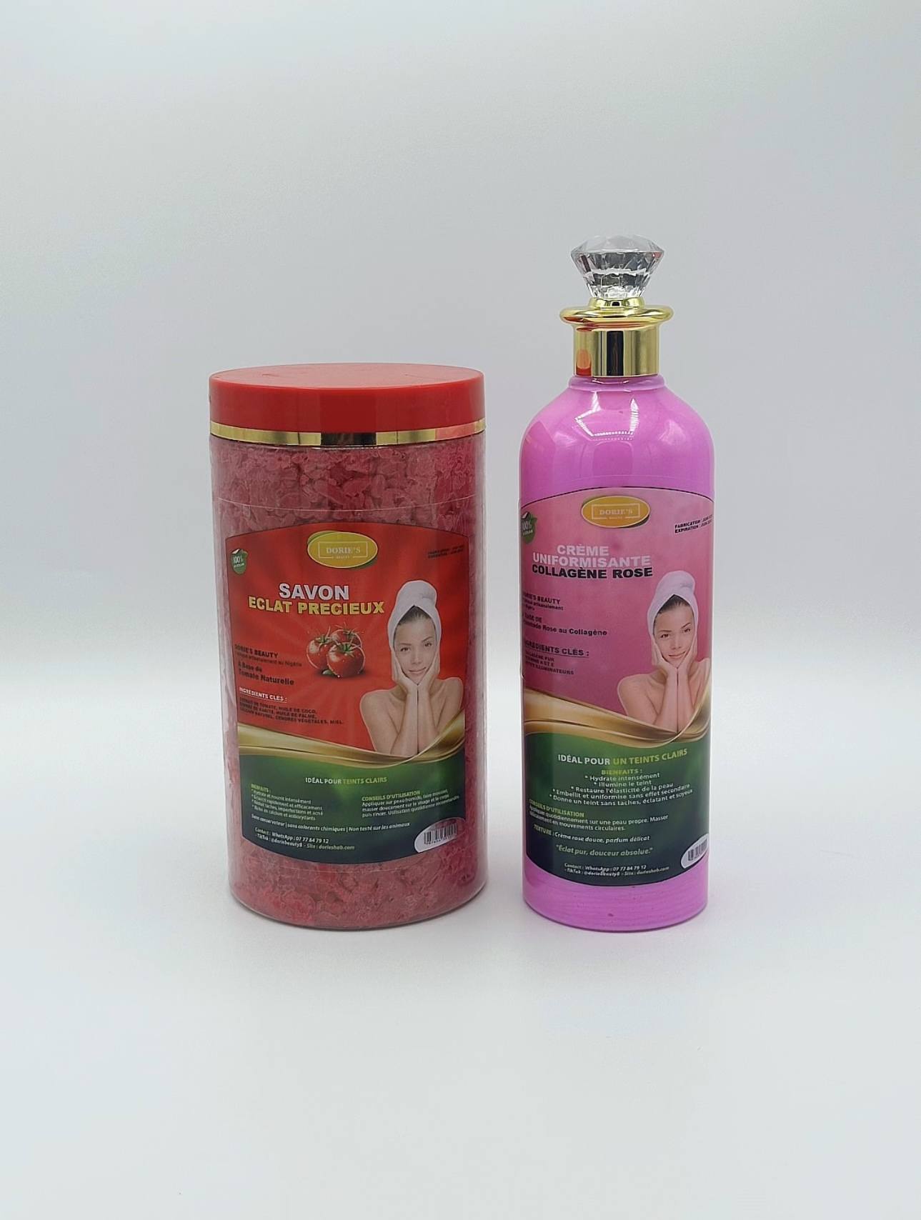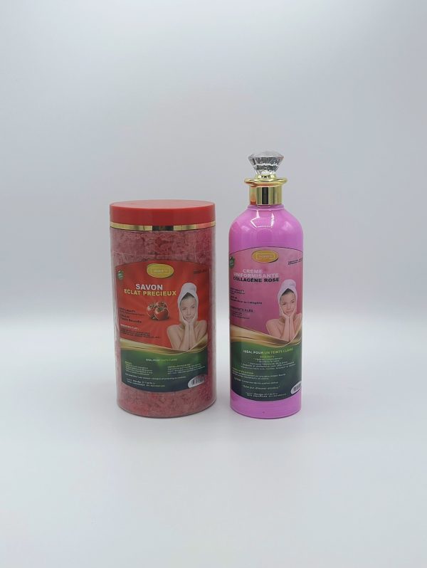Ce kit éclat précieux est conçu pour le teint clair. Il comprend un savon nigérian à base de tomate et une crème au collagène rose. Parfait pour une routine de soin visage rafraîchissante et nourrissante.